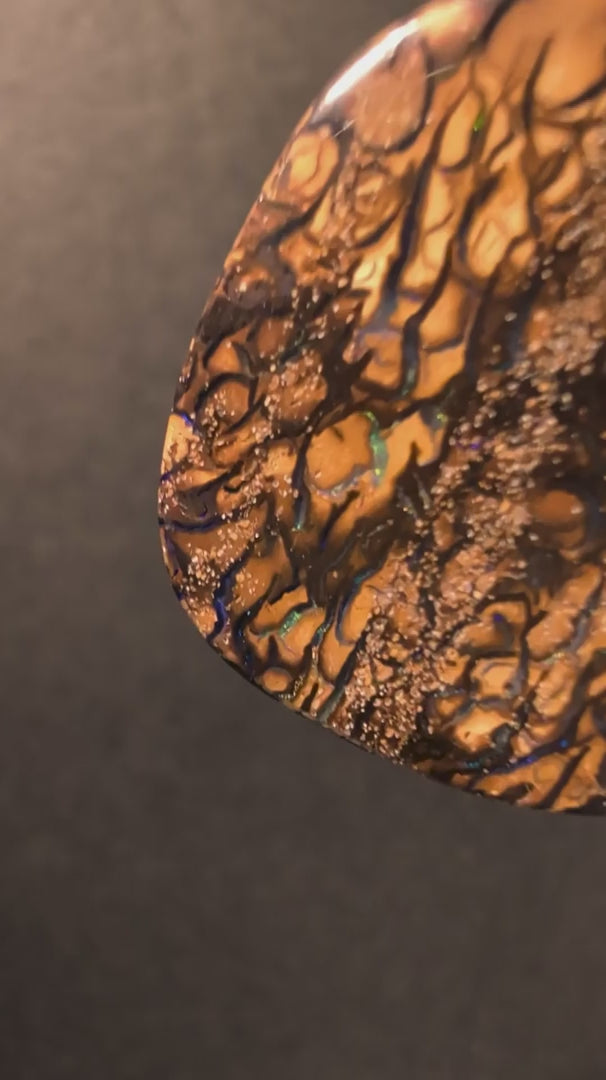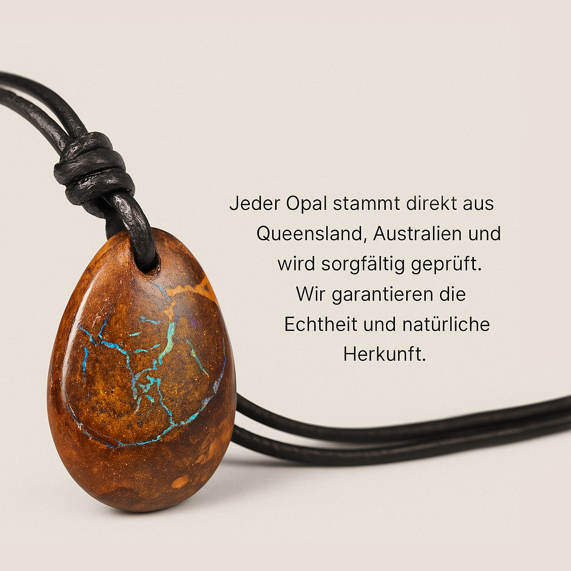 Dieser Yowah Boulder Opal ist wie ein Kapitel aus der Geschichte Australiens – kunstvoll gezeichnet von der Natur selbst. Seine tiefbraune Matrix gleicht einer Landkarte, durchzogen von feinen, leuchtenden Opaladern, die in Blau, Grün und Türkis schimmern – als würden kleine Bäche durch trockenes Outback fließen. In der Mitte zieht sich ein Streifen aus hellem Gesteinsstaub, der wie eine lebendige Naht das Stück durchzieht – einzigartig und roh zugleich. Jeder Blick auf diesen Stein offenbart neue Details: Glitzernde Adern, mikroskopisch feine Strukturen und ein sattes, erdverbundenes Farbspiel, das seine Herkunft aus Yowah, Queensland, nicht nur verrät – sondern feiert. Die leicht asymmetrische, organische Form verstärkt seinen natürlichen Charme und macht ihn zu einem Unikat, das so nur einmal existiert.